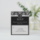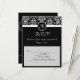 Elegant black background with black and white monogram initial seal, Matching RSVP cards for the wedding invitation. Fresh and elegant damask accent, this invite has a vertical orientation. Customise online with your wedding details.
