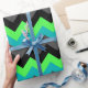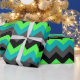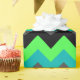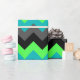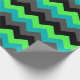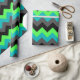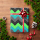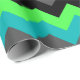 A roll of wrapping paper featuring an elegant pattern design of multicolored chevrons in black, grey, green and turquoise.