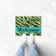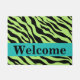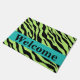 Welcome visitors to your home with this stylish and sophisticated black and lime green zebra skin pattern door mat. This door mat is customised with the word Welcome that you can change to another word or name. A turquoise teal blue strip gives an area for personalisation and colour. Enjoy this popular and contemporary design that will add a trendy home decorative accent. This design is available in several colour combinations in this store.