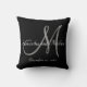 Personalised black and white and grey monogrammed pillow with last name initial, bride and groom first names and wedding date in script font typography overlay printed on a solid colour background. Elke Clarke© for MonogramGallery at Zazzle. Makes a great gift for newly weds or the wedding couple. Elegant, trendy accessory for your bedroom, favourite chair, as fun home decor in your family room or formal decorative addition to your living room as a wedding keepsake.