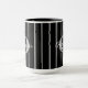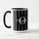 Grey stripes all over this coffee mug over Black with an interior and handle in Black. A monogram sits in the centre for you to personalise. Shown here is a sample monogram of a "O" and a breezy text reading "Oregon" across the O. Grab some for your next Sunday in the cave.