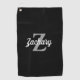 This personalised golf towel features a light grey monogram initial and white retro script name on a black background. The perfect Father's Day or birthday gift for the golfer dad, grandpa, or husband on your list.