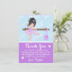 An adorable black haired ballerina in a purple tutu performing ballet beside a ballet barre in front of a mirror.