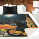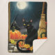 A black cat sits in a doorway with pumpkins, lantern, broomstick, autumn leaves and a full harvest moon in behind.
