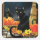 A black cat sits in a doorway with pumpkins, lantern, broomstick, autumn leaves and a full harvest moon in behind.