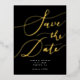 Elegant save the date postcard featuring hand written calligraphy text in gold on a black background.