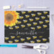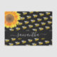 Decorated with happy, smiling yellow and black bumble bees and a large watercolored sunflower. A chic black background. Personalise and add a name. The name is written with a modern hand lettered stylie script with swashes. To keep the swashes only delete the sample name, leave the spaces or emoji's in front and after the name.