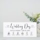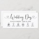 Modern black and white wedding day timeline cards feature a stylish typography design with wedding day event icons, timing information, chic calligraphy script, and heart accents. The simple and elegant custom text that can be completely personalised with the bride and groom names, wedding date. and timeline details.