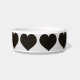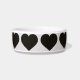 This pet feeding bowl features a repeating pattern of shapely black hearts.
