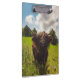 Black highland cow grazing green field sun light. Photograph of a majestic black highland Scottish cow grazing on a summer green field with grass in mouth and chicory flowers in front. In the background there is a beautiful blue sunny cloudy sky. Available on many products varying from prints to party supplies and sport equipment.