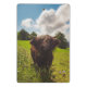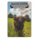 Black highland cow grazing green field sun light. Photograph of a majestic black highland Scottish cow grazing on a summer green field with grass in mouth and chicory flowers in front. In the background there is a beautiful blue sunny cloudy sky. Available on many products varying from prints to party supplies and sport equipment.