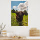 Black highland cow grazing green field sun light. Photograph of a majestic black highland Scottish cow grazing on a summer green field with grass in mouth and chicory flowers in front. In the background there is a beautiful blue sunny cloudy sky. Available on many products varying from prints to party supplies and sport equipment.