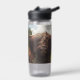 Black highland cow grazing green field sun light water bottle