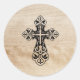 This Elegant Retro Style Christian Sticker features a Black Cross design on a brown wooded texture pattern background.