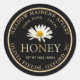 Personalise with your apiary name, product (honey), net weight, and beekeeper name and address. Not sure of your honey net weight? There's a list of common conversions (grams and ounces) in the form field when you customise your label. Striking white daisy photo on black background with double gold border. "Honey" has a metallic gold gradient.