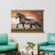 A majestic horse gallops across a field as the sun sets, casting a dramatic glow in the sky. The scene captures the beauty and energy of the horse against a backdrop of vibrant colours.