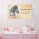 A birthday banner with a beautiful illustration of a black horse head with a fancy floral embellishment by it's neck. Elegant and classy animal painting. The background has a fancy abstract design in a light yellow colour with faux gold flecks. Some faux gold foil confetti along the top.