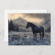 A striking black horse stands majestically in a serene snowy landscape, its dark coat contrasting beautifully against the crisp white snow. The tranquil, wintry scene captures the beauty of nature's stillness, with delicate snowflakes drifting gently around the horse.