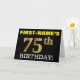 This birthday greeting card design features a message like "FIRST-NAME’S 75th BIRTHDAY!", with the "75th" having a faux/imitation gold-like colour appearance. The recipient’s name on the front can be personalised, and the front background is coloured black. It also features a personalised birthday greeting message on the inside. A birthday greeting card like this could perhaps be given to somebody in celebration of their seventy fifth birthday. [~Z0000183]