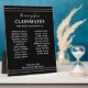 This charming white on black school reunion memorial standing plaque is a beautiful way to remember and honour those classmates who have passed, but will always be remembered. There is room for up to 24 names.