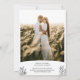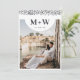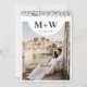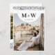 Double sided wedding save the date card in white with muted black accent colour. Photo save the date with your initials in large charcoal letters beneath hand drawn flowers and greenery. Floral line art save the date card personalised with your photo.