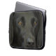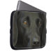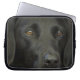 Close up / macro photo of black labrador retriever dogs face on a laptop sleeve.