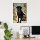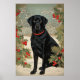 A black Labrador Retriever sits in a snowy winter scene, framed by holly branches with red berries. The dog has a red collar and looks directly at the viewer with a calm and dignified expression. The background features a snowy forest with bare branches and a soft, muted colour palette. The image evokes a sense of tranquillity and the beauty of winter.