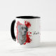 A beautiful water colour portrait of a black Labrador Retriever stands out against a bright red abstract paint splatter background. The image is on two sides of the mug, with your name or other custom text in black between them.