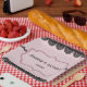 Create your own personalised wedding tableware. These paper plates feature your names and wedding date set inside an ornate frame with a black lace illustration accent against a soft pink background with a faux quilted pattern.