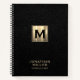 Modern notebook features a minimal luxury design with brushed metallic gold monogram on a simple black leather print. Custom name and title, role or subject in classic block typography, centred in lower-thirds.