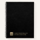 Modern notebook features a minimal luxury design with brushed metallic gold initial logo on a simple black leather textured print. Custom name and title, role or subject in classic block typography with company name in the lower thirds. Shown with a custom name and title on the front in modern typography, this personalised business notebook is designed with custom text. You can personalise by changing the text using the fields provided, or use the "message" button to contact the designer for help.