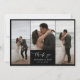 Photo collage wedding thank you card in black with white fonts. Flat wedding thank you card with photos printed on one side and lines on the other so you can write a thank you message by hand. Wedding thank you card printed with photos and your names with Thank you written in a white calligraphy script. Timeless and tasteful wedding thank you card with a photo collage with three of your wedding photos.