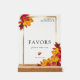 Create a captivating focal point at your wedding reception with our exquisite favours acrylic sign. This stunning design features a rustic backdrop of autumn dry leaves, complemented by a shorter, transparent panel adorned with a shimmering gold frame and surrounded by autumn foliage. The couple's names are elegantly displayed in the upper corner, adding a personalised touch.