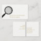 Stylish minimalist business card in gold, black, and white with a large magnifying glass. A clean minimalist business card for a private eye.