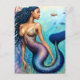 This postcard features artwork of a brown-skinned mermaid with long blue and purple hair and fish tail posing in an underwater scene with fish, seaweed, and coral. Her eyes are closed as she serves fierce fish! Ocean-core aesthetic with a pretty black girl.