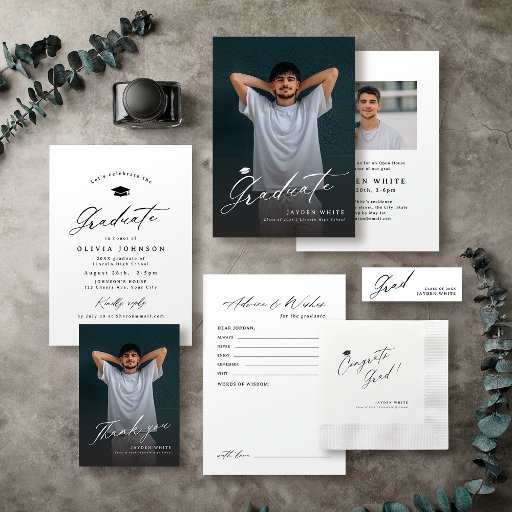 Modern Calligraphy design with graduation cap in black and white, simple and unique. great personalised banner for graduation party backdrop.
