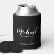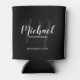This can cooler features personalised groomsmen's name in white modern script font style and monogram in light grey modern script font style as background with title and wedding date in grey modern sans serif font style on black background.