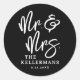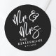 These custom round stickers feature a clean black background with “Mr. & Mrs” in large white handwritten script at the center. Directly below, the couple’s last name and wedding date appear in classic white serif fonts, creating a timeless and balanced look.