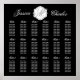 A black and white seating chart for a wedding reception with the bride and groom's names and monogram. This chart includes places for up to 18 tables, and can be customised for your reception.