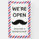 Open for business banner for a barbershop with red, white, and blue stripes and a big moustache. Personalise with your business name. Vertical open for business banner for a barbershop with a classic red, blue, and white striped border and a black moustache.