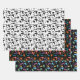 Hair stylist themed wrapping paper sheets featuring a pattern of scissors, combs, and hair dryers in three different colour variations: black and white; tomato red, yellow, blue, and purple on black; and pastels against a black background.