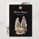 Beautiful black Christian Christmas card featuring a scene with Mary, Joseph and the infant Jesus Christ in the manger in Bethlehem on the front and a watercolor painting of poinsettia, holly and red berries at the back.