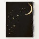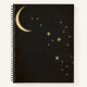 Black night sky with a bold gold crescent moon and multiple stars tumbling across the sky. Choose from sketchbook, bullet journal, checklist, graph paper, recipe book, or lines in various widths and colours. Also choose a spine colour to further customise your notebook look.