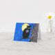 This notecard has a black owl with blue eyes sitting on a branch in a black and white tree with a yellow moon and stars in a night blue sky.