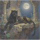 A black panther themed sticker. On the front is an illustration of a majestic black panther with fur like molten black and gold, laying on a cliff ledge bathed in ethereal moonlight. Intricate carvings adorn crumbling stone pillars, and bioluminescent flora casts a soft, otherworldly glow. The scene is rendered in a rich, textural oil painting style with thick, .