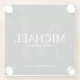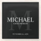 This coaster features personalised groomsman's name with title and wedding date in white and monogram in grey as background, in classic serif font style, on black background.