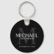 This keychain features personalised groomsman's name with title and wedding date in white and monogram in grey as background, in classic serif font style, on black background.