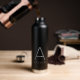 Professional-looking and elegant simple and understated large personalised name and initial letter stainless steel water bottle with a Custom Monogram in a trendy modern and minimal classic sans serif font for a professional, simple and masculine look. Shown in grey on a black metallic water bottle, the text colours and fonts can be changed, and several bottle colours are available in small and large sizes.