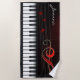 Modern black piano with white keyboard and gradient red notes and treble clef. Optional monogram