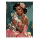 The image depicts a glamourous, vintage-inspired scene featuring a black woman dressed in an elegant, strapless pink gown adorned with delicate floral embroidery. She exudes sophistication, accessorised with a multi-layered pearl necklace, matching earrings, a sparkling bracelet, and a large, ornate ring on her finger. A pink flower with a jewelled centre adorns her voluminous, retro-styled hair, which is swept into an intricate updo. In her arms, she gently holds a small, tabby kitten with a white and grey striped coat, its wide eyes gazing outward. The background is a textured, teal-blue wall with a slightly distressed appearance, adding a touch of contrast to the overall luxurious and feminine aesthetic of the scene.